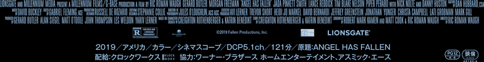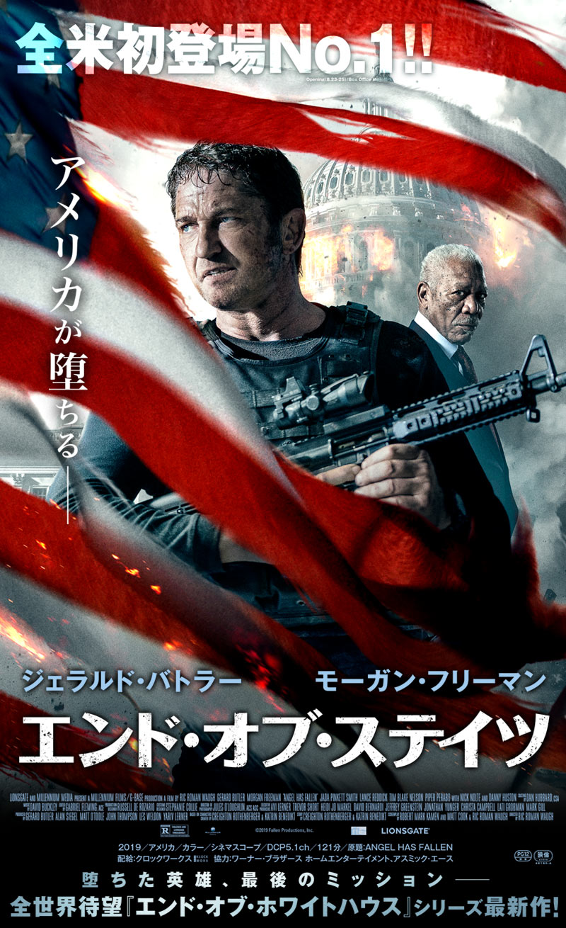 アメリカが堕ちる― 全米初登場No.1!! (Opening(8.23-25)/Box Office Mojo調べ) 堕ちた英雄、最後のミッション― 全世界待望『エンド・オブ・ホワイトハウス』シリーズ最新作! 《キャスト》 ジェラルド・バトラー モーガン・フリーマン 2019/アメリカ/カラー/シネマスコープ/DCP5.1ch/121分/原題:ANGEL HAS FALLEN 配給:クロックワークス 協力:ワーナー・ブラザース ホームエンターテイメント、アスミック・エース